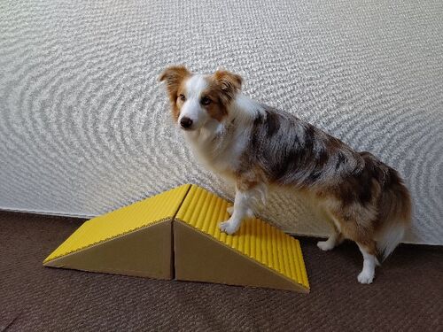 段差や坂を丁寧に乗り降りする練習をしたいのですが、我が家は室内に段差がなく、外に出る時の階段くらい。 散歩途中で階段やちょっとした段差で練習していたのですが、もっと手軽に練習したいな~と思っていました。 そこで何か代わりになるものがないか、…