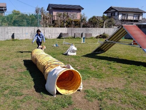 アジリティーレッスン2回目。 新しく習った「トンネル(コマンド=ハウス)」について今日はまとめます( ´∀`) まずは黄色いトンネル。 入り口で待たせ、わたしは出口から「ハウス」のコマンドで呼びます。 光が差すので中も明るく、直線では何の抵抗もなく通過…