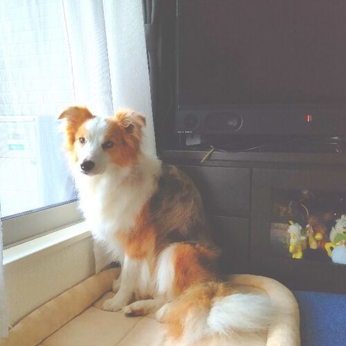 リビングの窓から外を見るのが好きなベル あっ、今は柵にカバーしてるから見えにくいけど ベランダでのプール遊びの水が飛ばないように&日除けね。 聞き慣れない音=外からだと思うのか、初めて聞く音は必ずこの窓から外を確認します。 テレビの音なのに〰️…